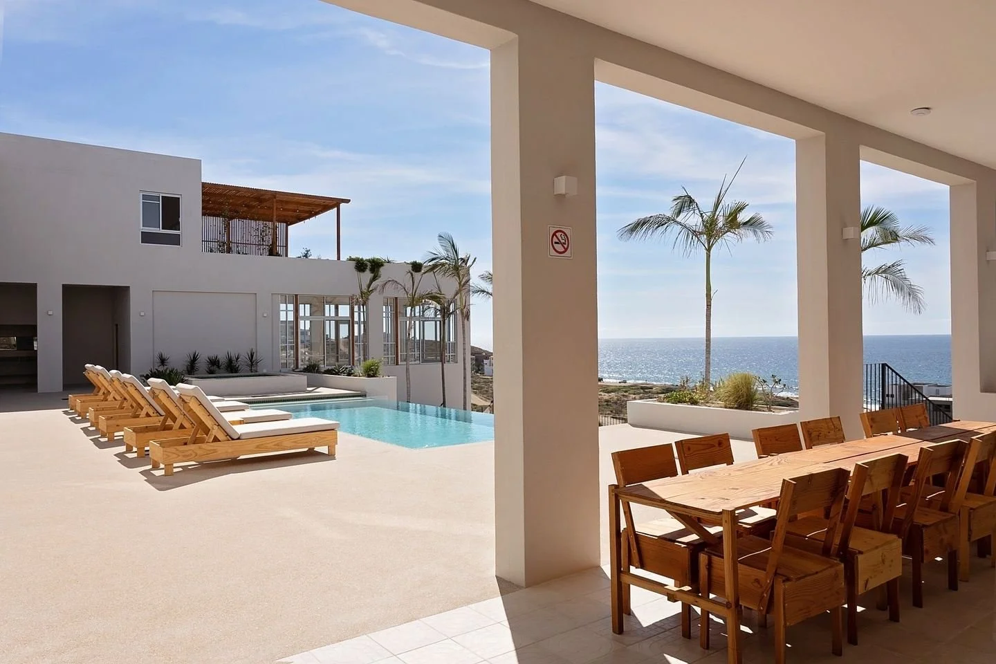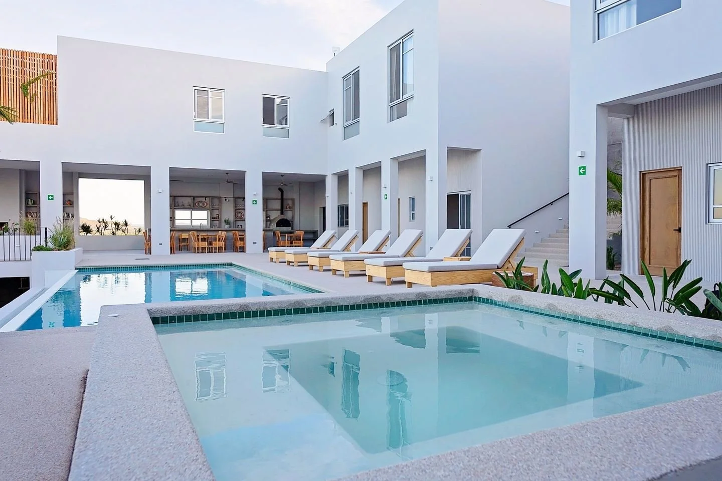 Where the desert meets the sea, our retreat venue is a boutique yoga and wellness sanctuary perched on a hillside overlooking the Pacific Ocean. Just steps from the beach—Cerritos and San Pedrito beaches are a short stroll away—and only minutes from the vibrant “Pueblo Mágico” of Todos Santos, the setting harmonizes coastal beauty with desert serenity. Our venue features beautifully appointed rooms, an intentionally designed, 800‑square‑foot yoga studio with floor‑to‑ceiling glass and 180° ocean views, a salt‑water pool, hot tub, and tranquil lounging areas to take it all in.